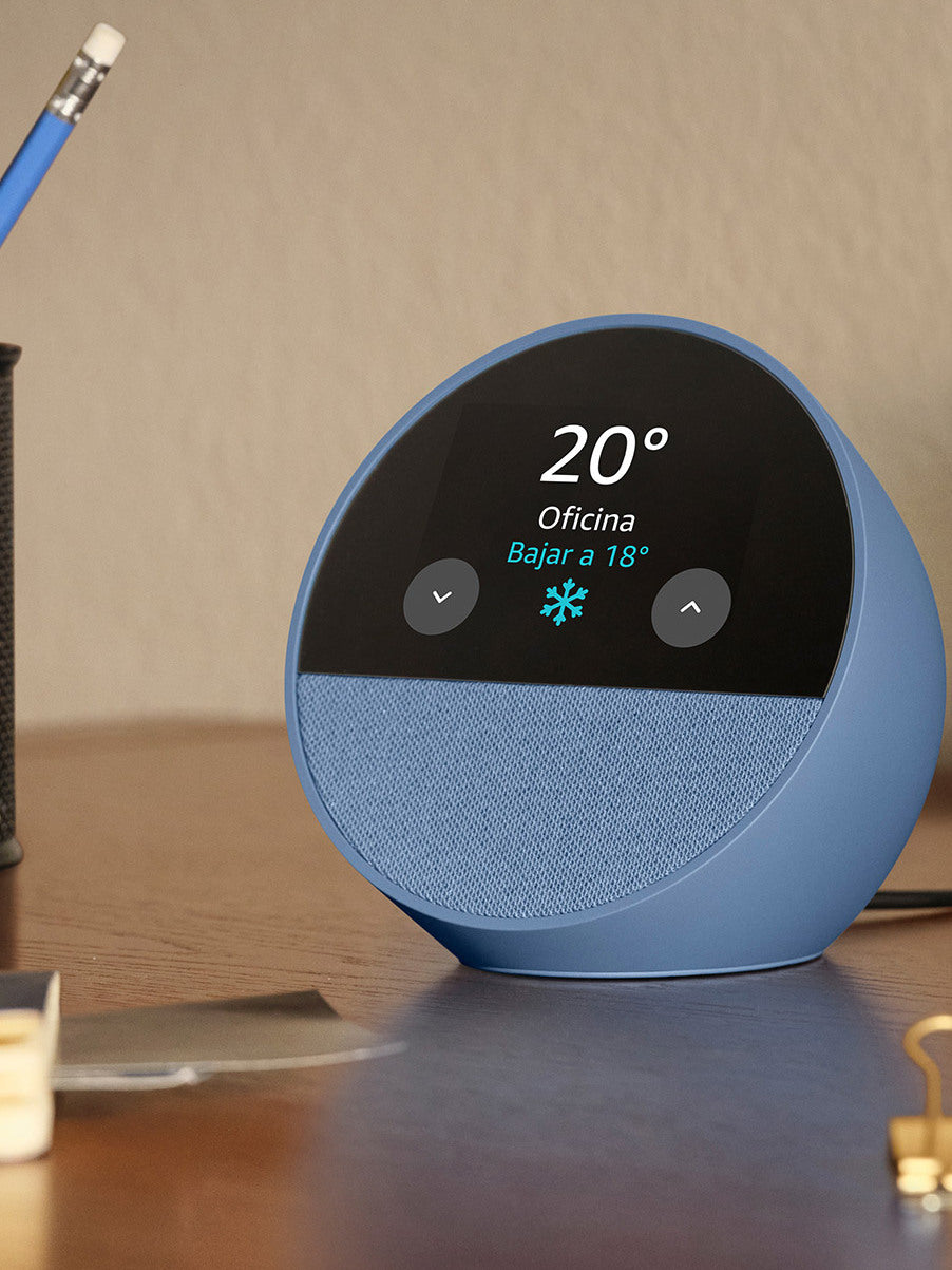 Descubre el Amazon Echo Spot, el dispositivo que lleva la conveniencia de Alexa a tu mesa de noche o escritorio, con el beneficio añadido de una pantalla táctil compacta. Este elegante híbrido entre un altavoz inteligente y un despertador te permite gestionar tu día, controlar tu casa y disfrutar de audio de calidad, todo con solo usar tu voz. Imagina despertar con música suave, ver el pronóstico del tiempo de un vistazo y apagar las luces, sin mover un dedo.